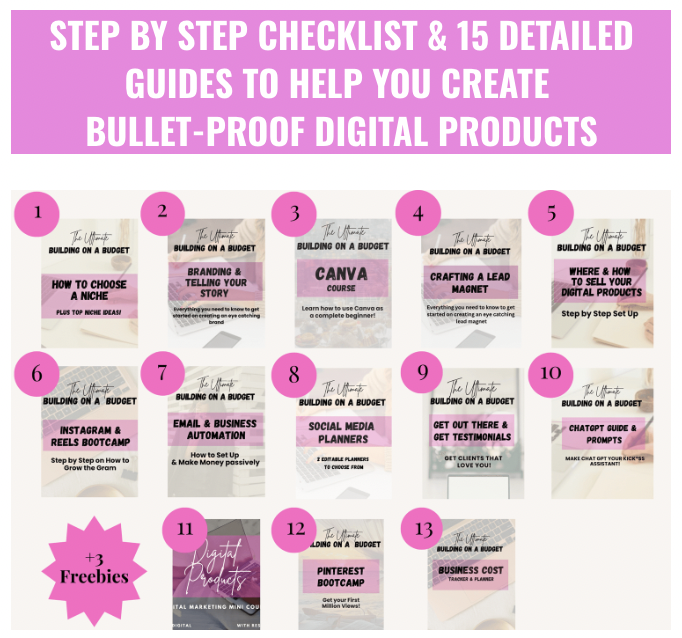 As a special launch offer, enjoy three exclusive freebies with your purchase: a Mini Course on Selling Digital Products (with resell rights!), a Pinterest Bootcamp to help you achieve your first million views, and a Business Cost Tracker to keep your finances organized.